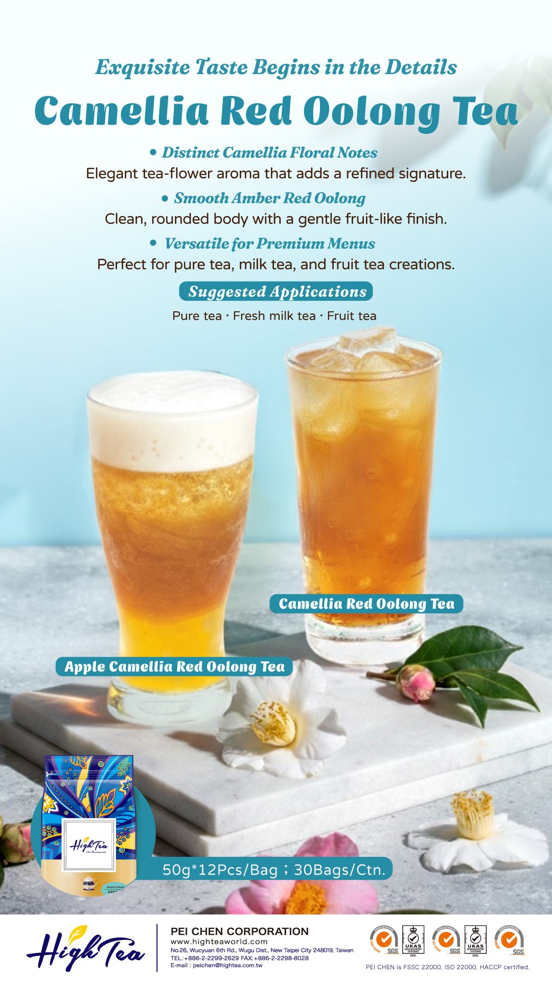 Made with red oolong and infused with camellia aroma, this tea offers a graceful balance of floral and fruity notes, a clear amber hue, and a smooth, refined finish—perfect for pure tea, milk tea, fruit tea, or sparkling blends.