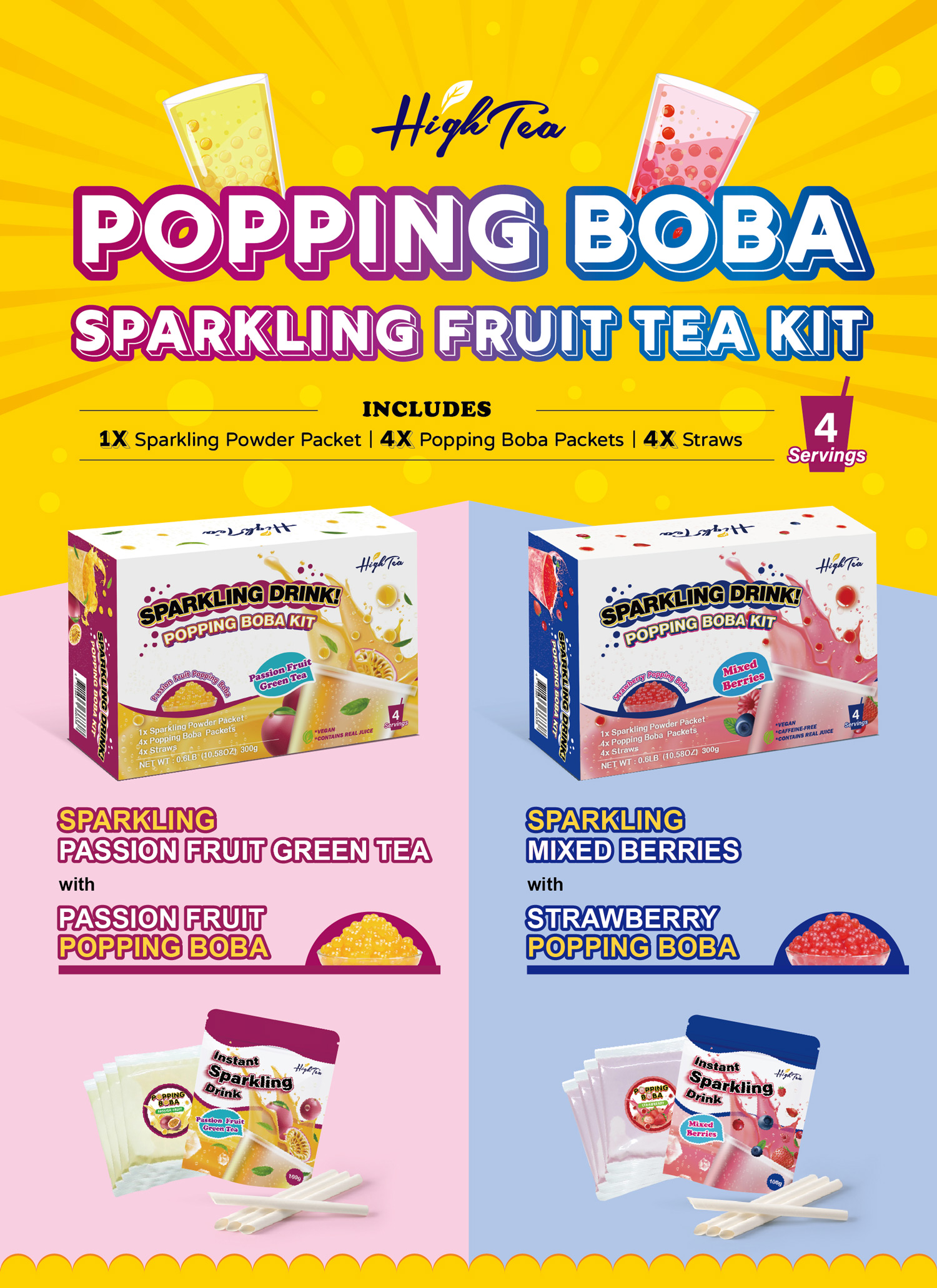Enjoy a tropical twist with our Passion Fruit Sparkling Green Tea Kit. Each sip delivers a burst of real passion fruit juice blended with green tea and light bubbles, paired with juicy passion fruit popping boba for a fun, chewy surprise. Contains about 15mg of natural caffeine per serving. Made with vegan ingredients and real juice. Each kit includes one sparkling powder packet, four popping boba packets, and four straws—perfect for four servings of refreshing fun.